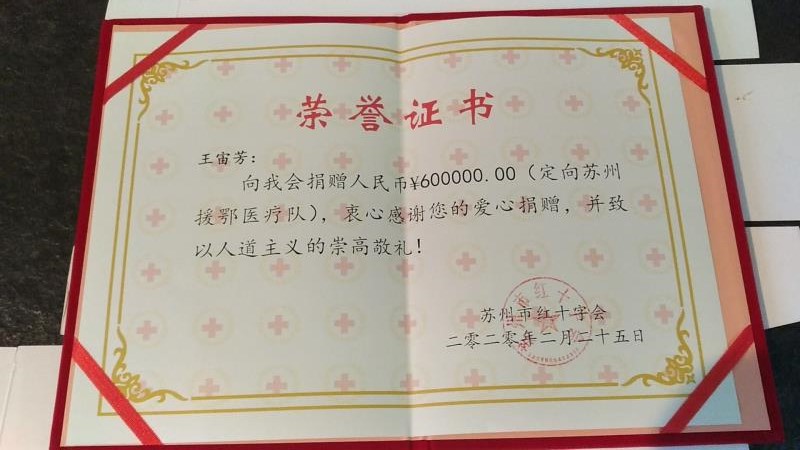 2020年2月25日,王宙芳第一次走出已隔离数十日的居住小区。她一大早就出发,乘坐十多站公交车后,一路问询找到位于苏州市竹辉路上的红十字会。已经满头大汗的她,气喘吁吁地向工作人员说明了来意,提交了一份亲笔书写的给苏州援鄂医疗队的感谢信,同时表示捐款60万元感谢驰援湖北的医护人员。苏州市红十字会再次确认她的来意,接收捐款,并向她颁发捐赠证书。王宙芳的心才慢慢平静下来。
