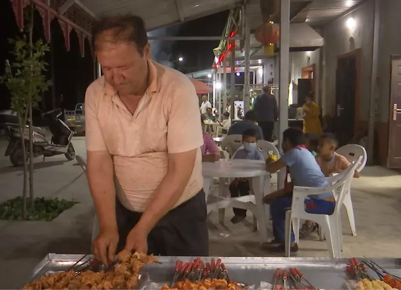 村民艾海提·提拉经营的烤肉摊