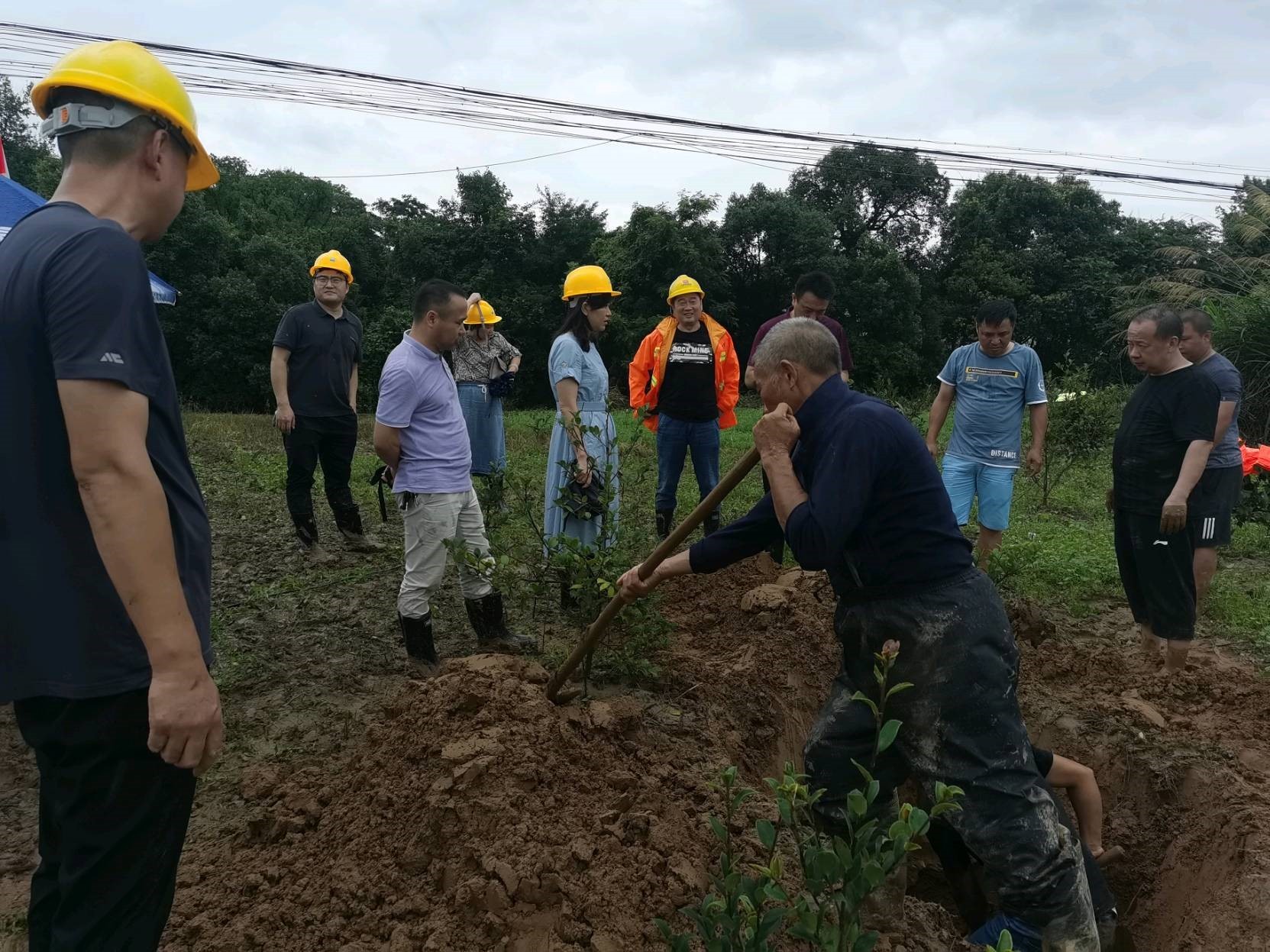 土地被洪水浸泡,挖土机用不上,只能靠人工挖掘,突击队员们二话不说,直接抡起铲子锄头开挖。整个上午,大雨滂沱,突击队在雨中挖掘,这里一边挖那里一边塌方,没有别的办法,只有发挥愚公移山的精神不停地挖,一点一点挺进,整个团队默契协作,一直到中午12点半左右,才找到了光缆。
