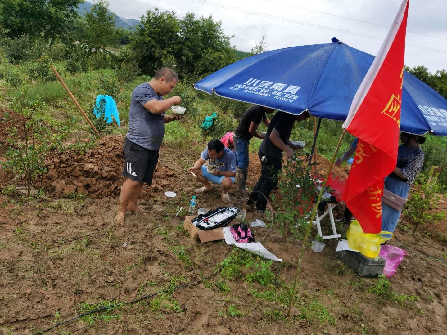 下午安排了4台熔接机工作,到了6点,雨停了,电缆也抢通了,圆满完成抢修任务!此时,大家才有心情吃盒饭,市公司领导与大家一样,有的站着、有的蹲着,在空旷的河边、傍晚湿润的空气中,享受一顿格外美味的盒饭。