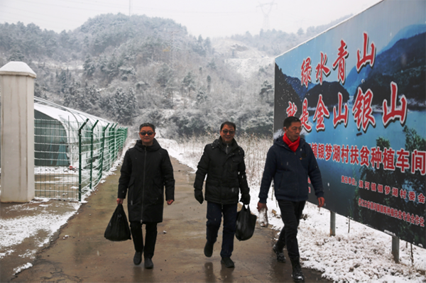 铁四院扶贫工作队冒雪巡查种植基地(左为朱浩)