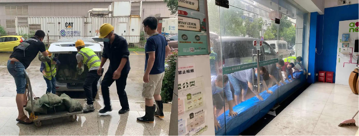 与此同时,武汉市区内多处路段渍水。抢修人员在重点机房、低洼基站、营业厅进出通道摞起一层层沙袋做好防护。一处任务完成,他们迎着风雨立即赶完下一处……