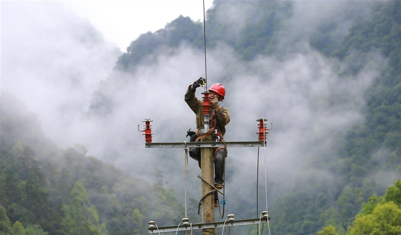 “这几个电工在杆子上淋了几个钟头的雨,喊他们下来躲雨都不下来!”作业点附近的村民杨绍兰很心疼这些“电骡子”。