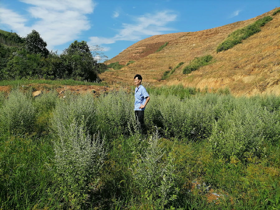 龙明君在茶树林、套种药材地里沉思