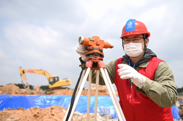 夏雨在陕北至武汉特高压武汉站施工现场运用水准仪检查土建施工质量