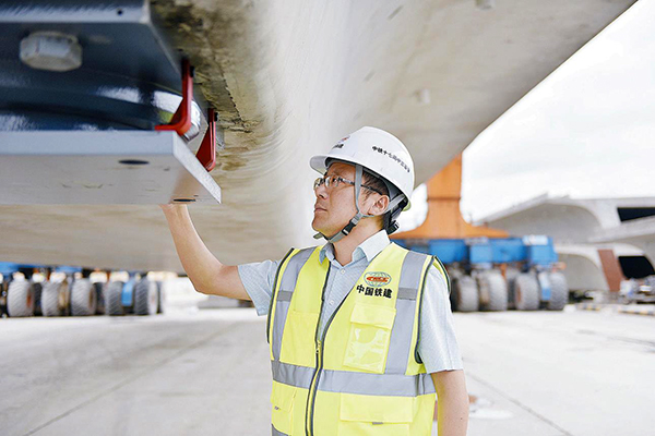 袁川贵在检查箱梁支座安装质量(段文婷 摄)