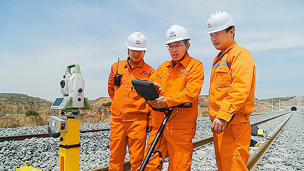 刘军华(中)和队友们在进行有砟轨道线路数据采集(冯学亮 摄)