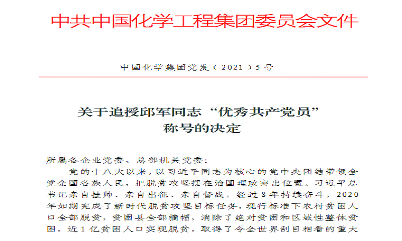 中国化学工程党委决定追授邱军同志“中国化学工程集团有限公司优秀共产党员”称号,并号召全体党员干部、职工群众,学习邱军理想信念坚定、对党无限忠诚的政治品格;学习邱军扎根基层、无私奉献的价值追求;学习邱军践行宗旨、赤诚为民的精神境界;学习邱军脚踏实地、务实创新的工作作风。