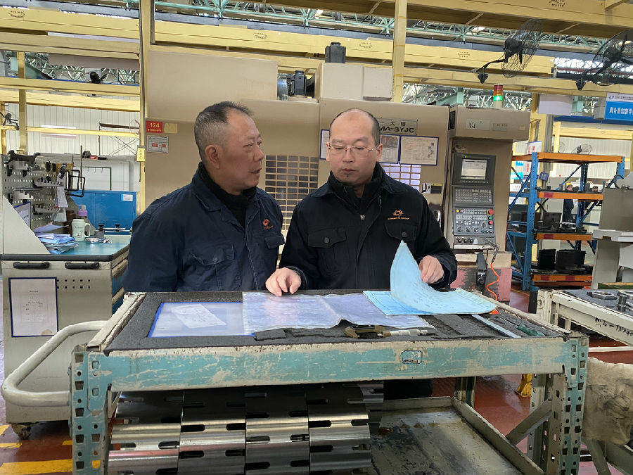 工艺技术员,更像是设计蓝图与产品成型之间的传输者。从读懂设计蓝图、到分解产品工艺、再到优化提升,这需要深厚的“内力”。作为一名新晋机加工艺员,肖玉斌怀揣期待与热血,挖掘自身潜能,迅速开启职场“小新”成长模式。进厂之初,他每天总是早早的到科室,认真跟随师傅张高学着消化图纸研究机加工艺。可对一个工艺员来说,现场也是他们的生命。不接触实物,仅凭看设计图纸,是不可能做好工作的。为了跟产品零距离接触,他虚心好学,驻扎生产现场,时常向机加前辈讨教学习。在那时,他便对自己立下“三入”要求,入眼入手入心。工艺设计完了,他总要比别人多花时间来总结成效;问题解决了,他还要探索是否能有更好的工艺方案,能不能比上一次干得更好更快……在一次次积累中,他从懵懂技术小新蜕变成为业务精湛的科室骨干、重关项目负责人、机加室主任,直至成为江麓集团冷加工专业领域的技术领军人才。