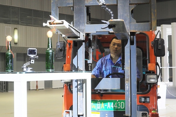 为了进一步提升自己的水平,王春阳给自己设计了一系列的挑战项目,比如挑战用啤酒的开瓶器挂酒瓶,将开瓶器固定在叉齿的前端,通过手脚对叉车的控制,用开瓶器挑起一个酒瓶,然后将啤酒瓶通过瓶盖上的锯齿挂在一条直线上。这样的操作,一般人用手都很难完成,而王春阳却能用叉车在直线上挂上十瓶,并且还能逐一取下,可以说他的叉车技艺已经达到了出神入化的地步。