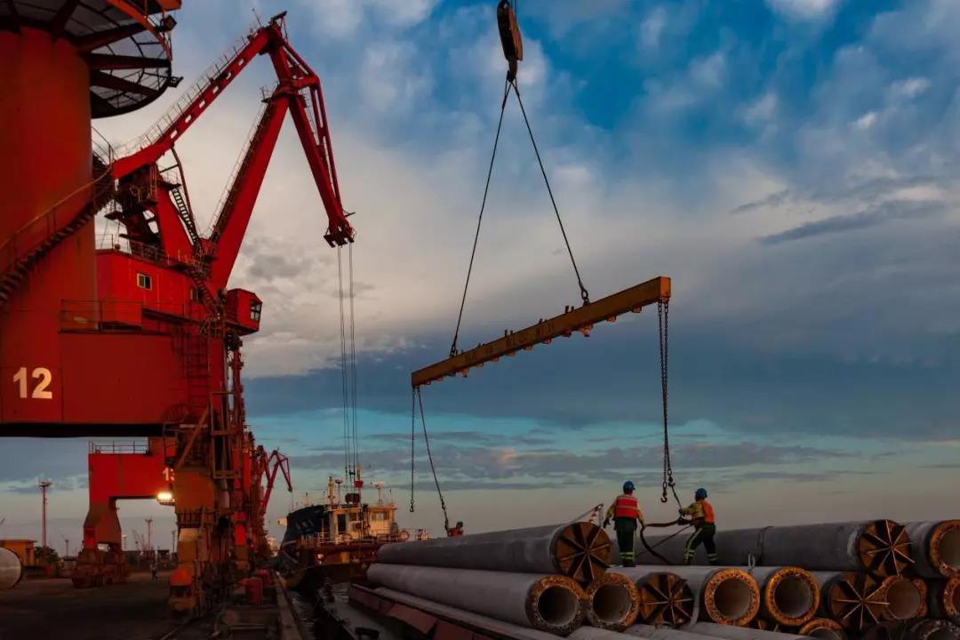 码头工人们用古铜色的皮肤记录着烈日的洗礼,用有力的双手紧握着执着的方向,为服务“一带一路”水泥管桩出口挥洒着汗水,贡献着力量。
