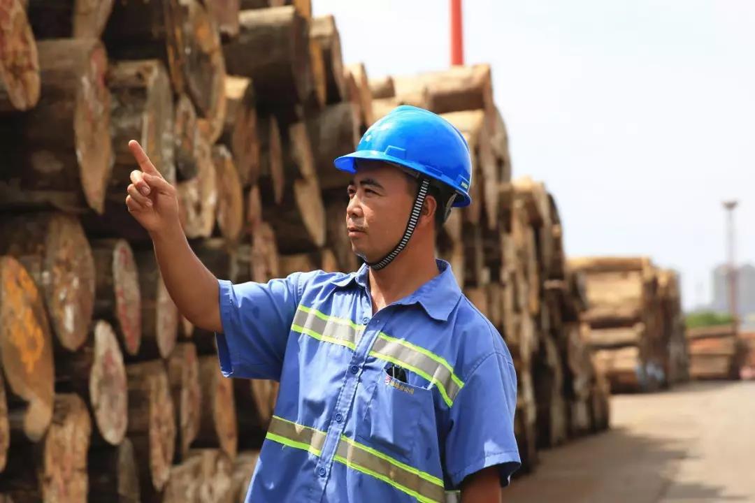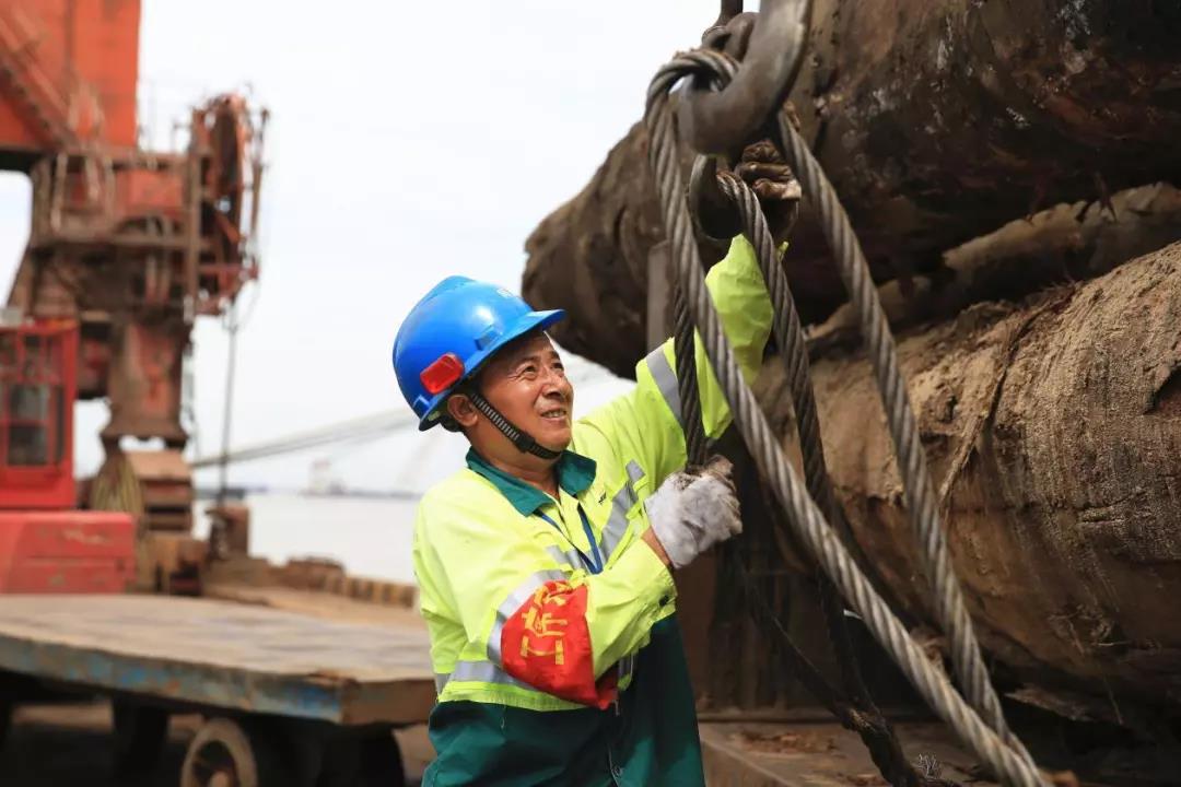 他叫闻惠荣,是一名牵引车司机,正在进行木材卸船水平运输作业,动车前,他落实好防暑降温措施,仔细检查木材装车质量。他说:“在燥热的天气里,我们更应该把安全放在第一位,保证好装车质量,运输才能更安全、高效!”