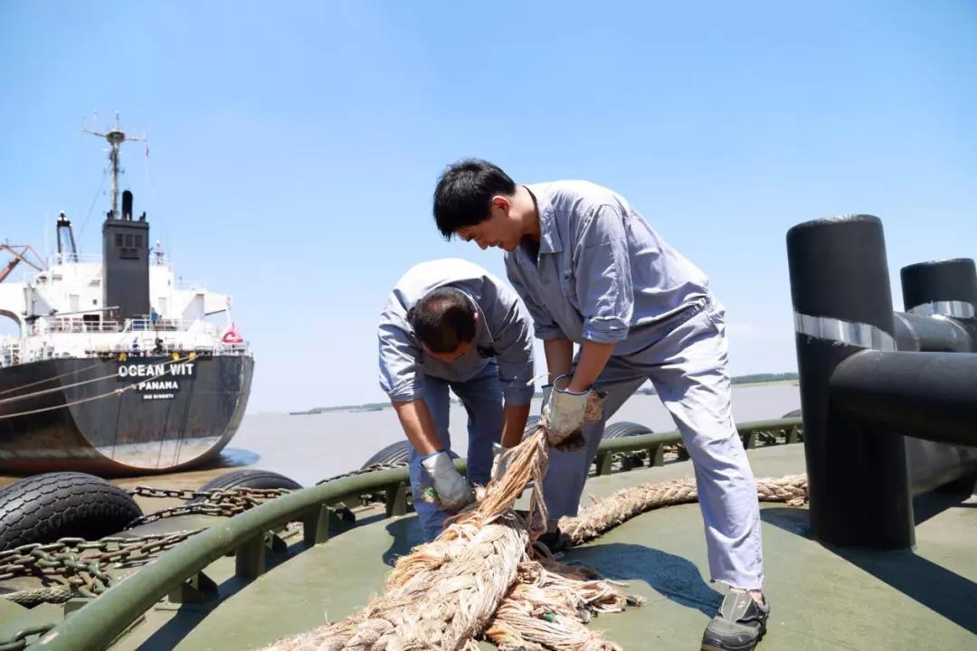 在“张港20号”轮滚烫的拖轮甲板上,大副唐海东、三副申建成,顶着炎炎烈日,有条不紊地进行着插接被损坏的缆绳的工作,全力保障。他们说:“缆绳损伤拖不得,作业安全最重要。”