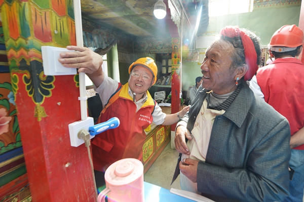 2018年6月,钱海军率志愿者前往西藏仁布县开展“千户万灯”公益项目。图为钱海军为当地村民修理家中的电灯