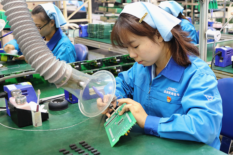 在中国通号北京工业集团北信公司电子加工中心组焊工序,付春艳手拿烙铁正在焊接眼前的一块印制板,在0.5mm间距的贴片集成电路引脚间,凭肉眼手工焊接数百条引脚,它们稳稳地粘接在印制板上,成为中国高铁信号设备的“大脑”与“中枢神经”,守护高铁运营安全。