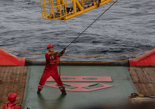 40分钟后,拖轮抵达涠洲6-8井口。“三条桩腿、两个人”,是6-8平台的固定配置。平台长朱云洪和操作工梁康海里里外外张罗着平台上的大小事务,为即将登上平台工作的员工做着各项准备。吊装作业、签发人员作业许可证、输送淡水,朱云洪和梁康海配合着,一上午,两人连喝水的工夫都没有。