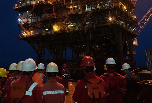 交通船一大早从涠洲12-1A平台出发,将操作和维修人员送至各个采油井口。