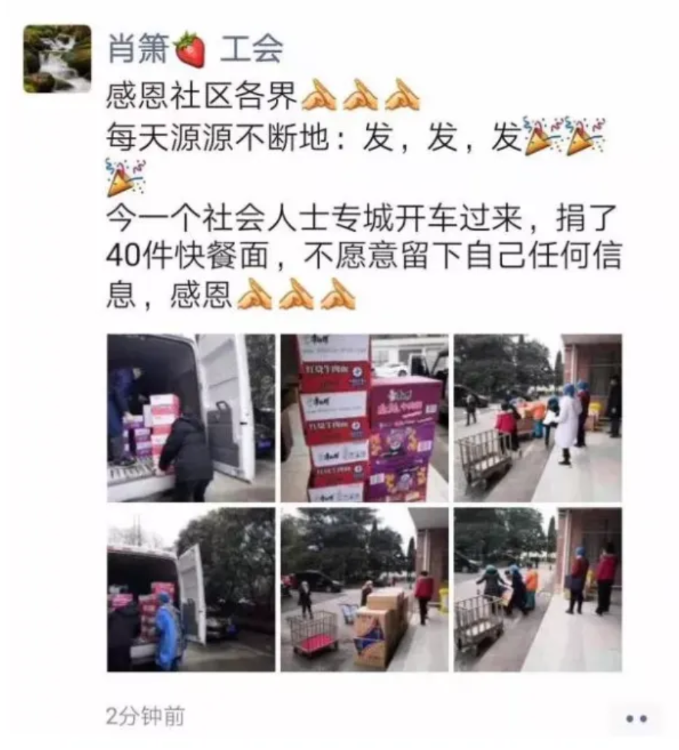 帮助了咱湖北院人,他还不甘心。荆州的疫情严重,海南医疗队、深圳医疗队来了一拨又一拨,物资告急的通知也一遍一遍被转发。他寻思着,虽然没有口罩、防护服之类的防疫物资,但我可以捐助一些食物啊,至少能让一线的医务人员工作到深夜的时候有口吃的。第二天,他拖着40箱方便面去了荆州医院。