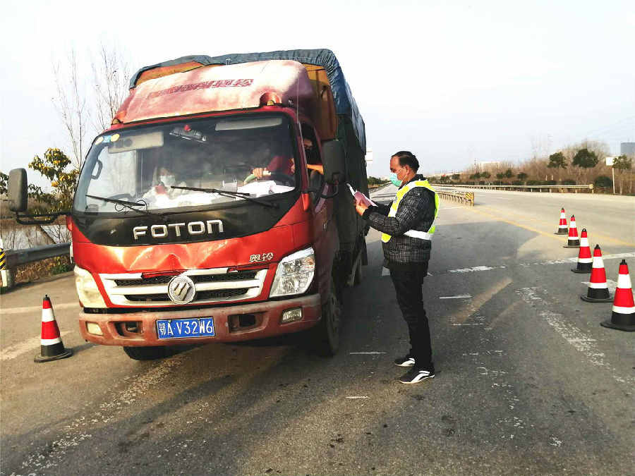 周潮俊在防控卡点对往来车辆和人员进行查验