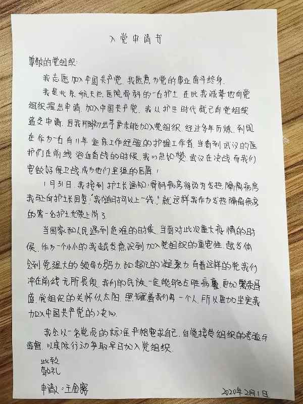 就在那天,王金露郑重写下了入党申请书。申请书上写着:当面对疫情的时候,作为一个渺小的我,越发意识到党组织的重要性,越发体会到党强大的领导力、号召力和凝聚力。