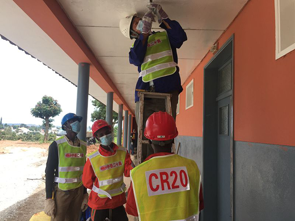 中铁二十局中方员工和安籍施工人员正在为安哥拉“小汤山”医院安装廊灯