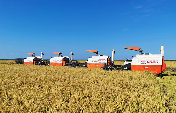 在金穗飘香的水稻收割现场,27台收割机在田间来回穿梭作业。500名当地种植户在收割水稻的同时,也收获着丰收的喜悦。