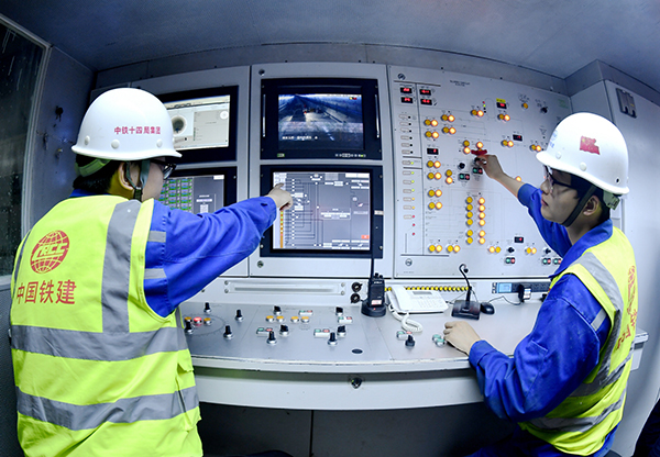 盾构施工人员在江底操作的大直径盾构机平稳掘进。