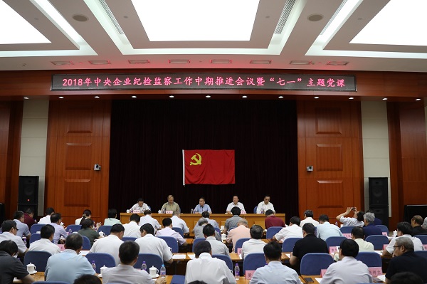 6月28日下午,中央纪委国家监委驻国资委纪检监察组召开2018年中央企业纪检监察工作中期推进会议暨“七一”主题党课,回顾党的光辉历史,深入学习贯彻习近平新时代中国特色社会主义思想和党的十九大精神,贯彻落实中央纪委二次全会精神和省区市纪检监察工作座谈会部署,坚持稳中求进基本工作方针,推动中央企业纪检监察工作实现高质量发展。中央纪委常委、国家监委委员、驻国资委纪检组组长、国资委党委委员陈超英出席会议并讲话。