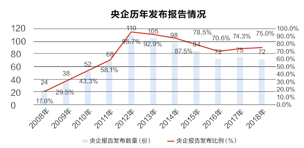 2018年,中央企业发布72份社会责任报告,发布比例与去年持平。38%的央企连续10年发布报告。央企英文版报告的比例提升了14%,国际化程度较高。