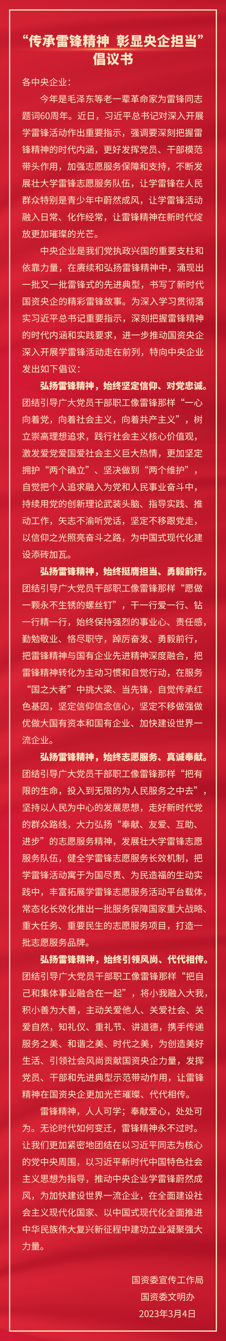 “传承雷锋精神 彰显央企担当”倡议书