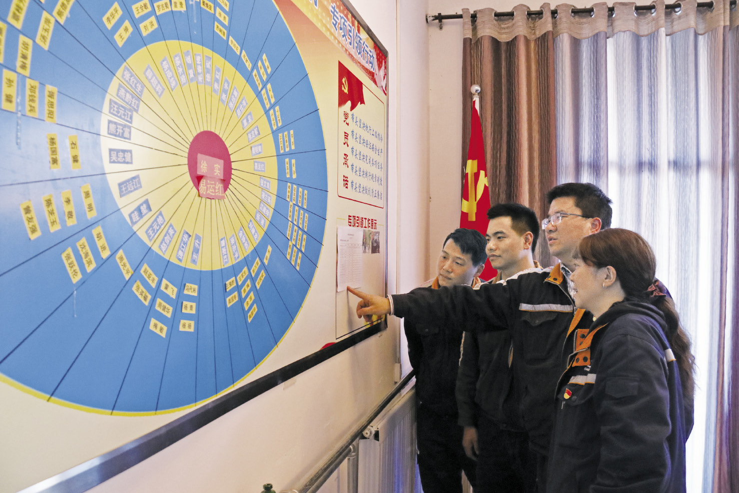 “三维度”构建积分体系。党支部将党员积分设为基础分、履职分、加分项三个维度。基础分是对一名合格党员的基本要求,主要评价党员履行党员义务、参加党内活动、完成党组织分配工作的情况,围绕政治合格、执行纪律合格、品德合格等方面,设定分值为60分;履职分是对党员发挥先锋模范作用的具体量化,主要评价党员在工作、学习中积极奉献、主动作为,发挥先锋模范作用情况,围绕发挥作用合格,设定分值为40分;加分项是党员在降本增效、科研创新、安全环保等方面作出的重要贡献,荣获上级荣誉或表彰的给予加分,设定分值为5分。在推进积分制实施过程中,党支部还建立了“一册、一表、一栏”工作运行模式,用积分工作手册明确了党员干什么、怎么干等方面的标准、内容、要求;用积分记录表规范登记党员参加日常学习、主题党日等事项;用公示栏一月一公示党员积分结果,接受党员群众的监督,为年底民主评议党员奠定了思想基础和组织基础。