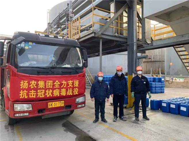 中化集团下属化工事业部党委着力统筹抓好消毒产品等防疫物资的生产,为抗击疫情提供保障。下属扬农集团党委紧急调度仪征厂区,组织成立抗击疫情党员先锋突击队,24小时满负荷生产次氯酸钠,增开盐酸工段的次氯酸钠工序,将次氯酸钠日产量提高到200吨,全力保障防疫消毒物资的供应,已陆续向武汉等地区捐赠288吨次氯酸钠。并主动承担保障扬州市及江苏省盐城、镇江等5个地级市的自来水消毒用涉水次氯酸钠供给的重任,每日供应12%涉水次氯酸钠产品165吨,同时,还对地方政府机关、社区以及扬州市127家单位无偿供应次氯酸钠,用实际行动支援抗疫一线。