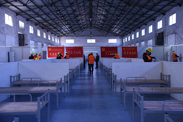 中铁十一局、中铁十四局抢建武汉客厅“方舱医院”。黄品青 摄