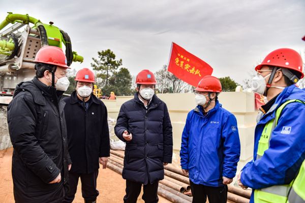 中建集团党组书记、董事长周乃翔,党组副书记、总经理郑学选调研火神山、雷神山医院工地现场。