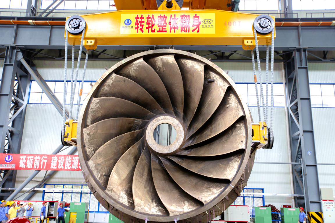 东方电气研制的白鹤滩首台机组转轮整体翻身。