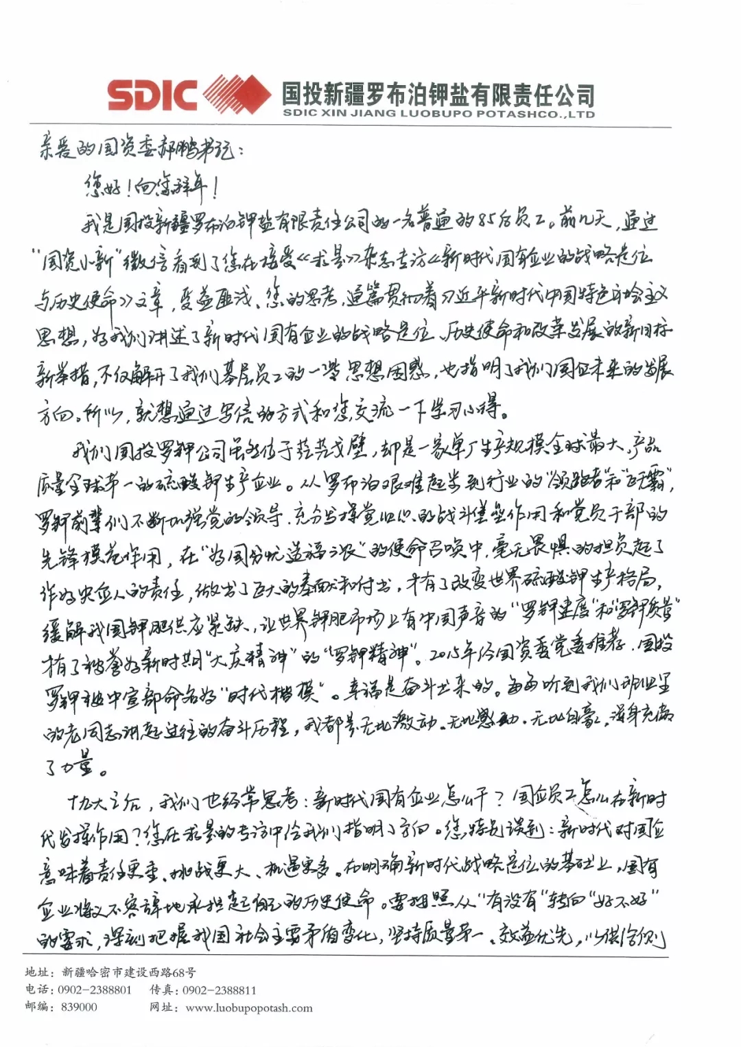 我是国投新疆罗布泊钾盐有限责任公司的一名普通的85后员工。前几天,通过“国资小新”微信看到了您在接受《求是》杂志专访的《新时代国有企业的战略定位与历史使命》文章,受益匪浅。您的思考,通篇贯彻着习近平新时代中国特色社会主义思想,为我们讲述了新时代国有企业的战略定位、历史使命和改革发展的新目标新举措,不仅解开了我们基层员工的一些思想困惑,也指明了我们国企未来的发展方向。所以,就想通过写信的方式和您交流一下学习心得。