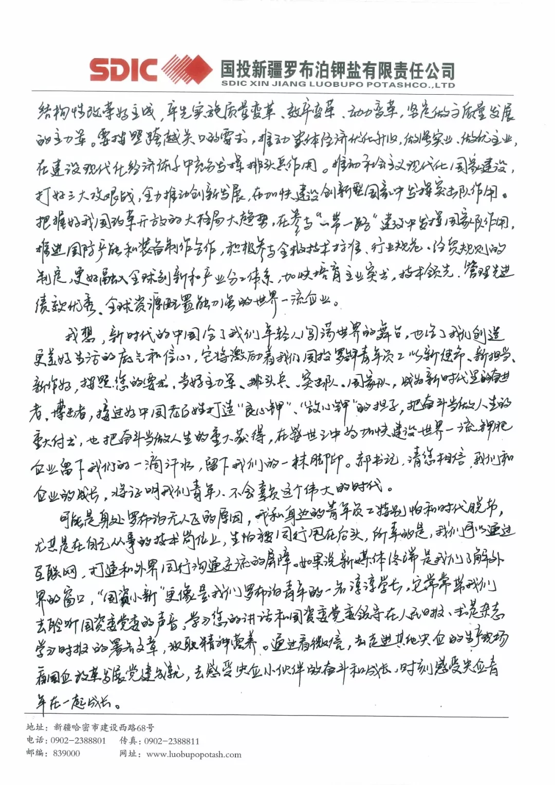 我想,新时代的中国给了我们年轻人闯荡世界的舞台,也给了我们创造更美好生活的底气和信心。它将激励着我们国投罗钾青年员工以新使命、新担当、新作为,按照您的要求,当好主力军、排头兵、突击队、国家队,成为新时代里的奋进者、搏击者,接过为中国老百姓打造“良心钾”、“放心钾”的担子,把奋斗当做人生的重大付出,也把奋斗当做人生的重大获得,在盛世之中为加快建设世界一流钾肥企业留下我们的一滴汗水,留下我们的一抹脚印。郝书记,请您相信,我们和企业的成长,将证明我们青年人不会辜负这个伟大的时代。