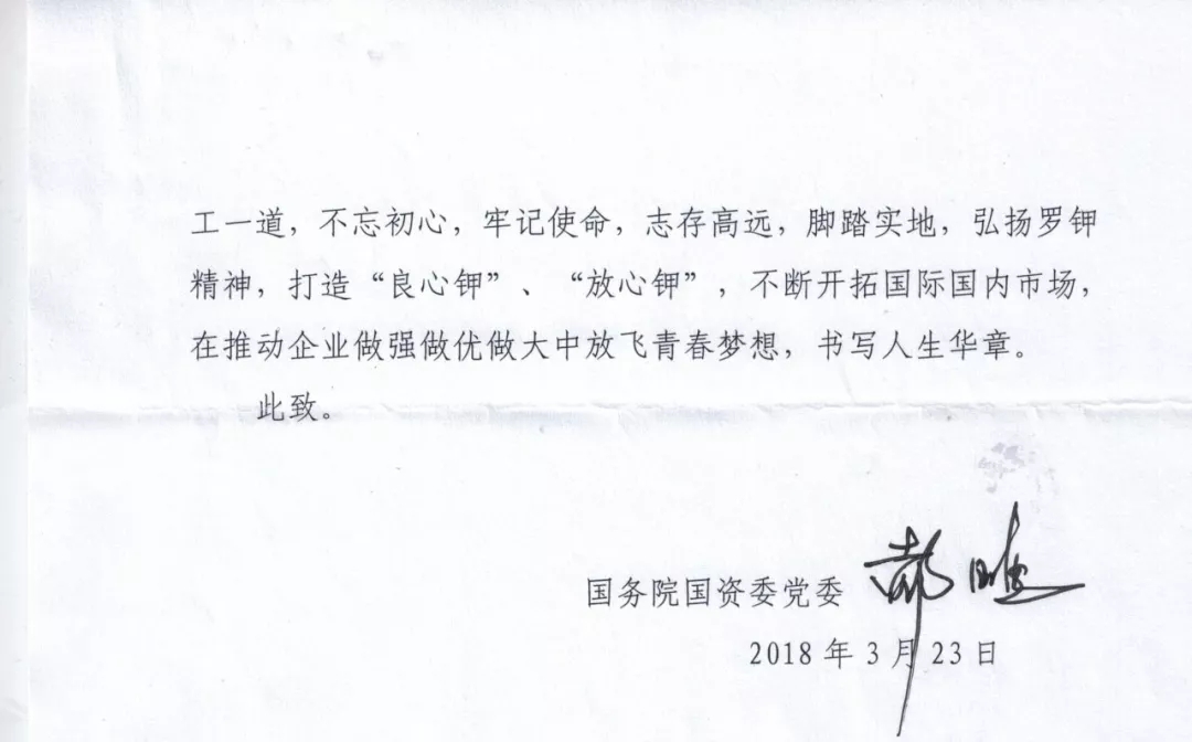 郝鹏书记对央企青年员工提出了殷切希望:希望罗钾人和广大国有企业职工一道,不忘初心,牢记使命,弘扬罗钾精神,打造“良心钾”、“放心钾”,不断开拓国际国内市场,在推动企业做强做优做大中放飞青春梦想,书写人生华章。