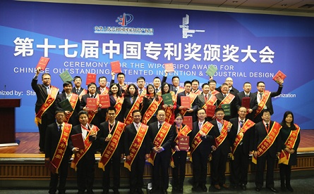 2015年12月15日,国家知识产权局和世界知识产权组织召开“第十七届中国专利奖颁奖大会”,发布《国家知识产权局关于第十七届中国专利奖授奖的决定》,分别颁发中国专利金奖20项,中国专利优秀奖507项,中国外观设计金奖5项,中国外观设计优秀奖57项。