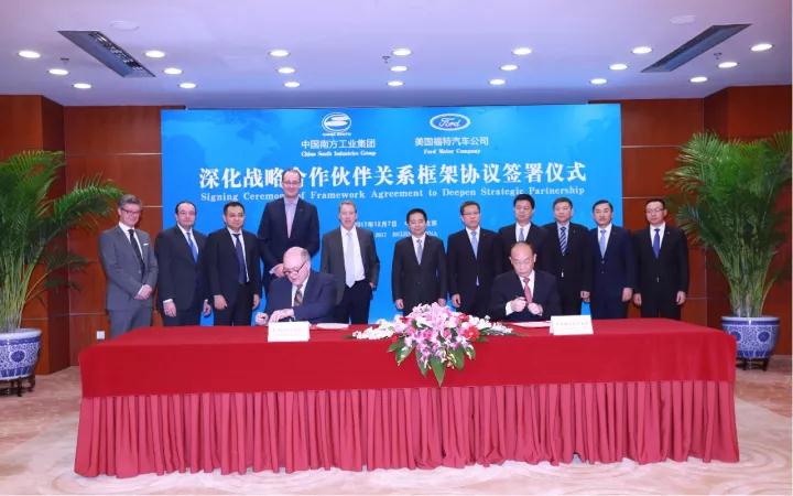 中国南方工业集团公司董事长徐平与福特汽车公司总裁兼首席执行官韩恺特(Jim Hackett)代表双方签署了协议