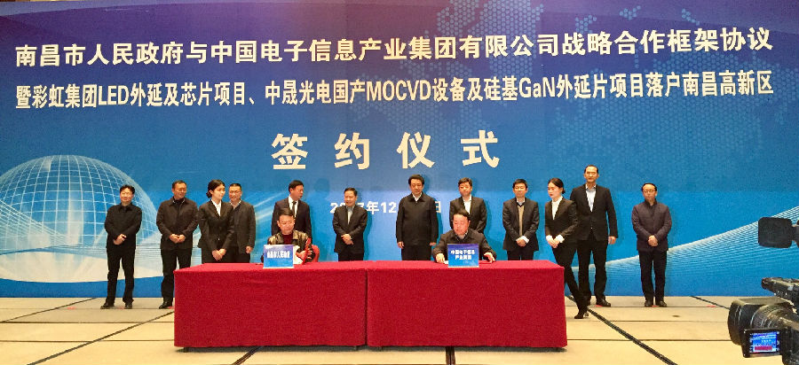 在签约仪式上,中国电子旗下彩虹集团分别与南昌高新区管委会签订LED外延及芯片生产项目投资协议,与南昌市高新区管委会、中晟光电签订国产MOCVD设备及硅基GaN芯片外延生产基地项目投资协议。