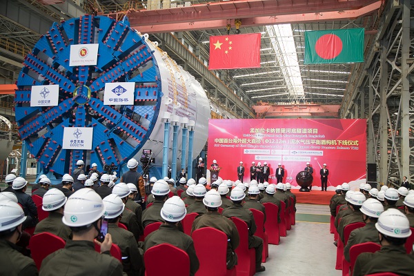 3月13日,由我国自主研发的出口海外最大直径盾构机在中交天和总装车间下线,将用于中国在海外最大的盾构公路隧道项目——孟加拉卡纳普里河底隧道工程。盾构机刀盘直径达12.12米、长94米、重2200余吨,是南亚地区投入使用的最大直径盾构机。此次中交天和超大直径盾构走出国门,进入由发达国家垄断的海外超大直径盾构市场。