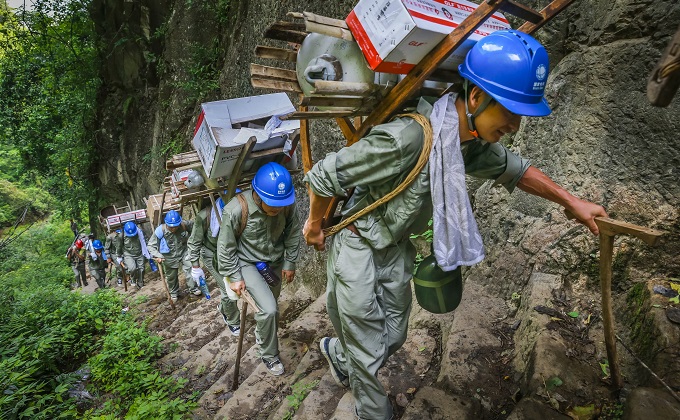 湖北省长阳县,土家电工用背架运送村村通动力电材料