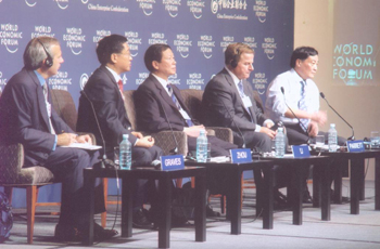 9月13日上午,国资委主任荣融出席了2004年世界经济论坛。中国企业高峰会中主题为"卓越企业,卓越领导人:中国及世界的挑战"的大会,并在会上作了题为"加快培育具有国际竞争力的大公司大企业集团"的演讲。会上,李荣融还就国有企业内部治理结构改革和加强与外国企业合作等问题回答了主持人和其他与会代表的提问。
