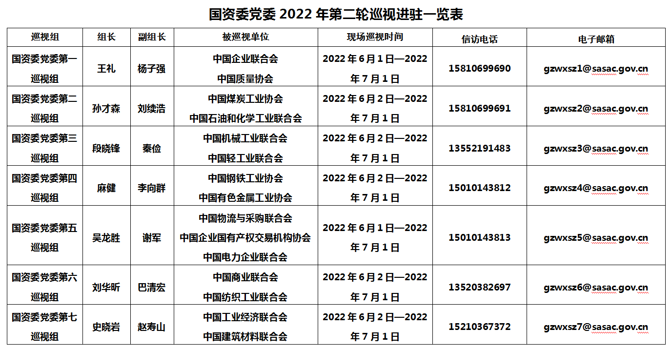 按照国资委党委和巡视工作领导小组部署安排,6月1日至2日,国资委党委7个巡视组分别进驻中国工业经济联合会、中国企业联合会、中国质量协会、中国商业联合会、中国物流与采购联合会、中国煤炭工业协会、中国机械工业联合会、中国钢铁工业协会、中国石油和化学工业联合会、中国轻工业联合会、中国纺织工业联合会、中国建筑材料联合会、中国有色金属工业协会、中国企业国有产权交易机构协会、中国电力企业联合会等15家协会党组织开展常规巡视。各巡视组组长作动员讲话,被巡视单位党组织主要负责人作表态发言。