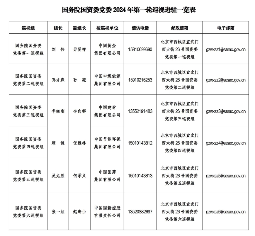按照国务院国资委党委和巡视工作领导小组部署安排,3月28日至29日,国务院国资委党委6个巡视组分别进驻中国黄金集团有限公司、中国中煤能源集团有限公司、中国建材集团有限公司、中国节能环保集团有限公司、中国医药集团有限公司、中国国新控股有限责任公司等6家委管中央企业党委开展常规巡视。被巡视企业分别召开巡视进驻动员会。国务院国资委党委各巡视组组长作动员讲话,对学习贯彻习近平总书记关于巡视工作重要论述,扎实开展本轮巡视提出要求。