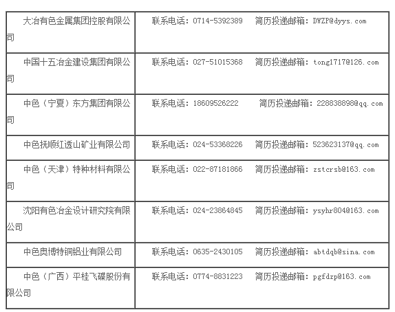 中国有色集团“掘金者”项目、中国有色金属建设股份有限公司、中色矿业香港控股有限公司、中色国际贸易有限公司、赞比亚中国经济贸易合作区发展有限公司、鑫诚建设监理咨询有限公司、中色卢安夏铜业有限公司岗位简历投递方式如下