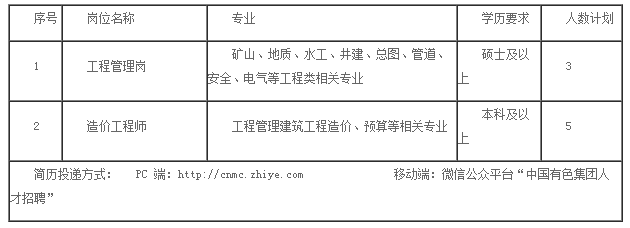 4、认可中国有色集团企业精神和价值观,愿意为国家的资源安全做出贡献。符合相关职位任职基本条件。