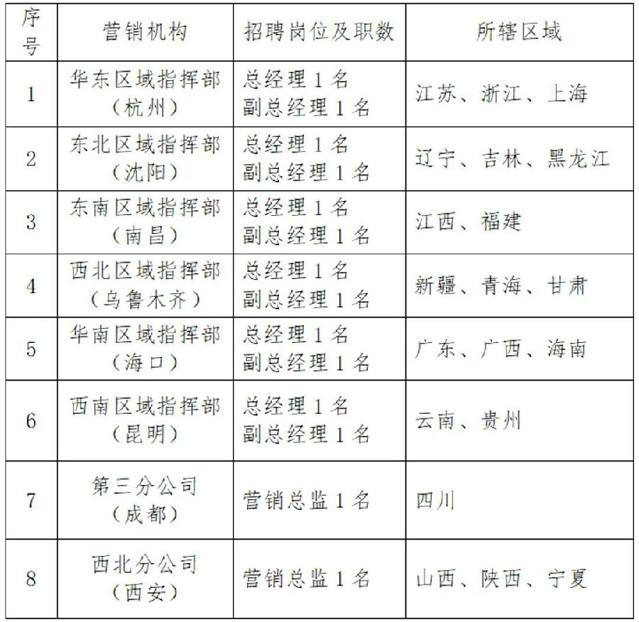 为推进公司“三年五年规划、十年三十年愿景目标”中长期发展战略,全面深化改革,创新管理体制,根据工作需要,拟公开招聘市场营销区域机构负责人,现将有关事项公告如下:
