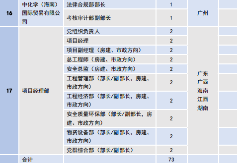 中化学南方建设投资有限公司是中国化学工程集团有限公司按照一类企业管理的全资子公司(总部位于广州市),成立于2018年2月,注册资金15.42亿元,是中国化学拓展南方区域基础设施建设与投资板块的重要机构,主责广东、广西、湖南、江西、海南、福建六省区的大基建领域投资管理与建设运营,以PPP、EPC、EOD等多种模式提供规划设计、产业招商、投资融资、建设施工及运营维护等全方位服务。公司现有子公司7家,具有建筑工程一级、市政工程一级、环保工程一级、防水防腐保温一级、消防设施一级等多项企业资质。根据业务发展需要,公司决定面向中国化学内部和社会开展公开招聘。现就有关事项公告如下: